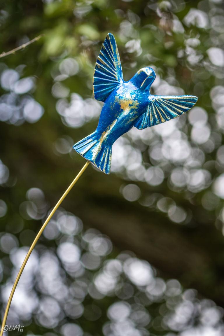 Der Künstler und die Stele mit dem Titel "The Blue Bird" (2021)