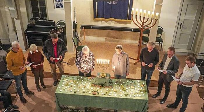 Anschließend wurden die Namen der 82 aus Vöhl stammenden Opfer des Holocaust verlesen – jeweils mit Alter und Todesort. Karl-Heinz Stadler hatte kürzlich weitere Namen jüdischer Opfer recherchiert, sodass sich die Zahl der bekannten Opfer erhöht hat. Zu Ehren der Verstorbenen wurden Kerzen entzündet. Nach einem Querflötenstück wurde ein Gebet in deutscher und aramäischer Sprache gesprochen. Mit dem aaronitischen Segen endete eine eindrucksvolle Gedenkstunde.HANS PETER OSTERHOLD